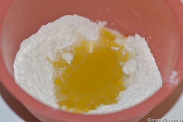 In una ciotola setacciate la farina, mescolatela con il sale e al centro metetete acqua e olio.