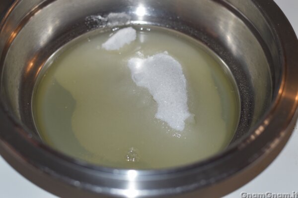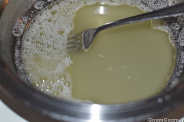 Aggiungete l’olio di semi e l’aroma alla vaniglia, e sbattete con una forchetta.