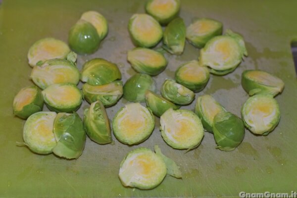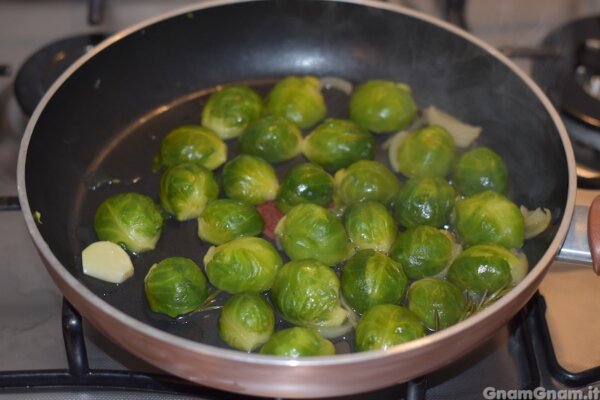 Aggiungete i cavoletti mettendo la parte piatta a contatto con la padella.