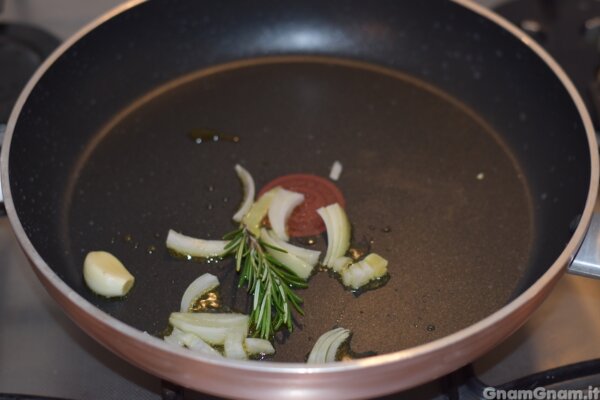 In una padella rosolate cipolla, aglio e rosmarino.