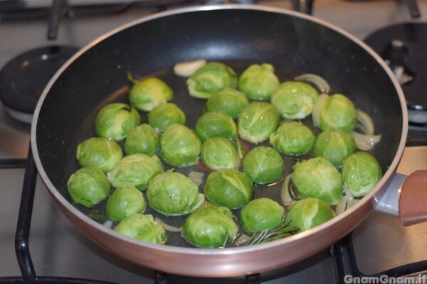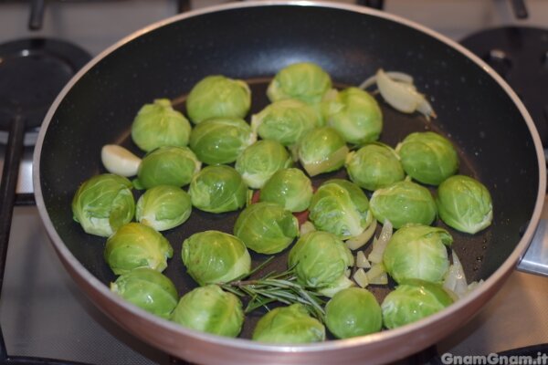 Vi confesso che non sono grande fan dei cavoletti, ma fatti in questo modo, con cipolla, aglio e rosmarino, piacciono anche a me. Per un tocco in più potete disporli su una pirofila, aggiungere pangrattato e parmigiano e farli gratinare in forno.