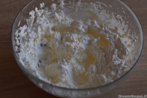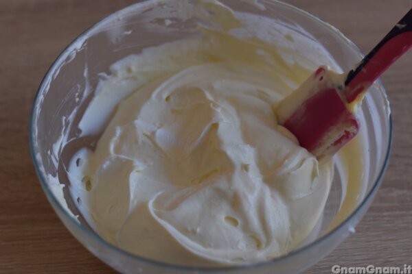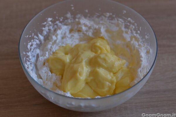 aiutandovi con una spatola. Se la crema pasticciera fosse diventata troppo compatta, prima di aggiungerla alla panna frullatela qualche secondo in un mixer o con un frullatore ad immersione.