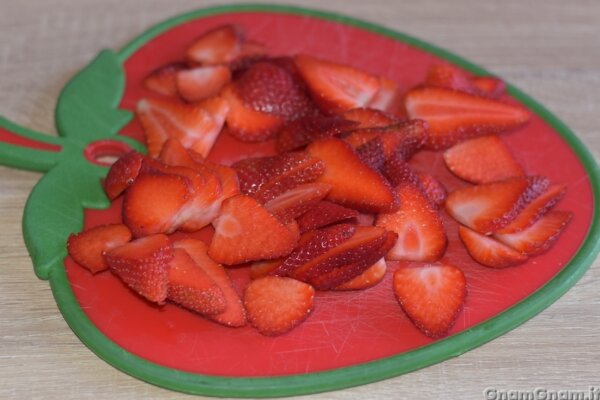 Sciacquate le fragole, eliminate il picciolo e tagliatele a fette spesse mezzo cm.