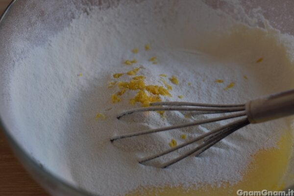 Per finire aggiungete farina, lievito per dolci setacciati e buccia di limone.