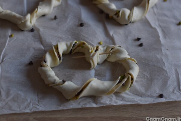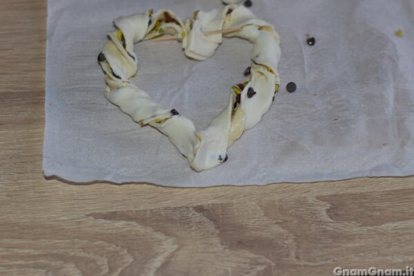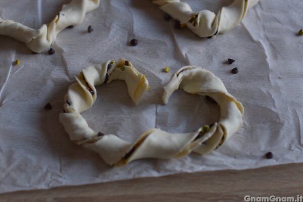 I cuori intrecciati dolci sono un dolcetto di San Valentino facile facile, che potete preparare in anticipo ed è perfetto per la colazione. Potete farcirli in tanti modi diversi, io ho scelto cioccolato e pistacchio, ma altre idee possono essere cannella e mandorle, crema di ricotta e gocce di cioccolato, uvetta e pinoli e così via.