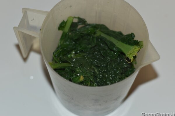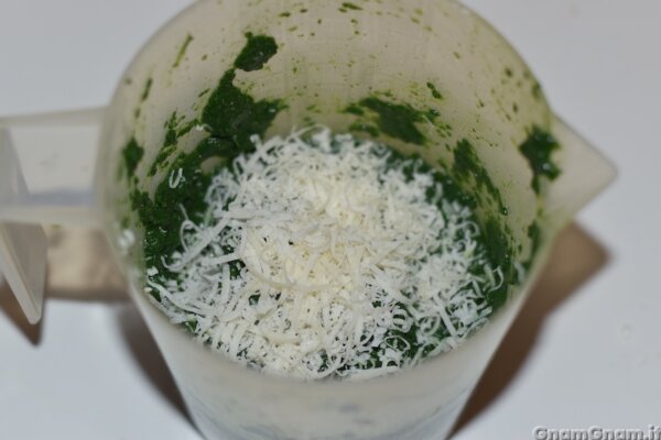 Frullate fino a ridurre in crema. Aggiungete sale e un cucchiaio parmigiano preso dal totale, e mescolate.