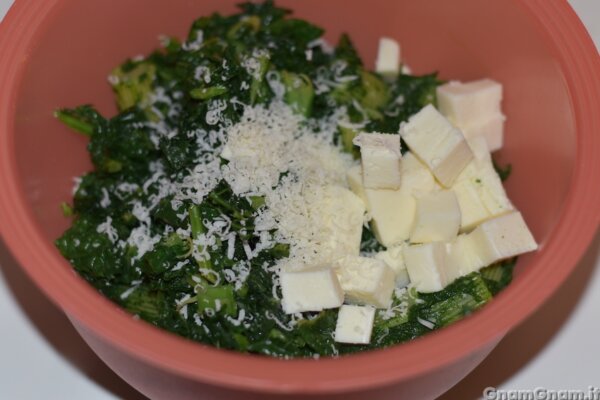 e aggiungete il cavolo a pezzi, e metà della mozzarella e del parmigiano grattugiato.