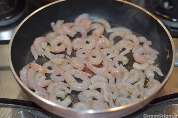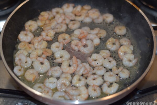 In una padella scaldate un po’ di olio e aggiungete i gamberi.