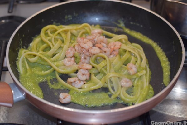 Aggiungete un po’ di acqua di cottura se necessario, spegnete e aggiungete i gamberi.