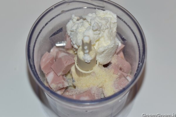 Preparate il ripieno mettendo mortadella, ricotta e parmigiano in un mixer.