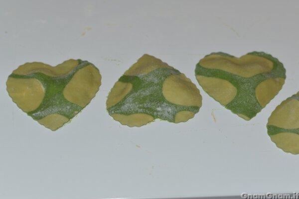 Questa ricetta doveva essere diversa, nella mia testa infatti dovevano venire fuori dei ravioli con dei cuoricini ben visibili. Solo che ho calcolato male le misure e i cuori sono diventati enormi, quindi una volta ricavati i ravioli, si vedevano solo dei pezzi di un altro colore, ma non si capiva fossero cuori. Perciò, nel caso vogliate che si notino, fateli molto più piccoli dei miei, ma proprio parecchio più piccoli!
