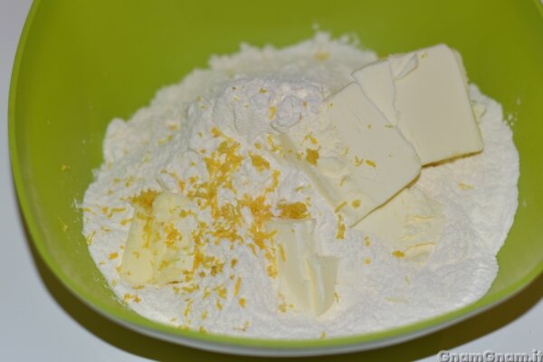 In una ciotola mettete farina, buccia di limone e burro.