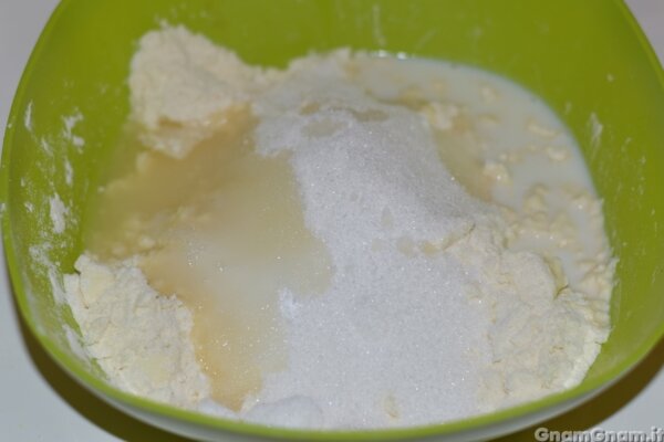 Lavorate con la punta delle dita fino ad ottenere un composto sabbioso ed aggiungete latte, zucchero e succo di limone.