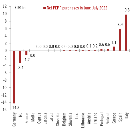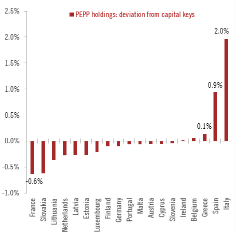 E l’Italia? Guardate questi grafici, i quali ci mostrano rispettivamente il breakdown degli acquisti Bce di debito sovrano nel bimestre precedente alla chiusura del programma di sostegno pandemico (Pepp) e la deviazione totale ad oggi dal principio di capital key.