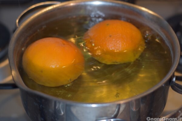 Sciacquate le arance e mettetelein un pentolino e copritele con acqua. Fate cuocere per circa 15 minuti da quando l’acqua inizia a bollire.