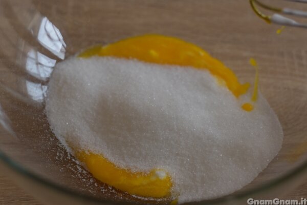 Lavorate i tuorli con lo zucchero.