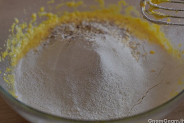 Aggiungete le mandorle, la farina e il lievito setacciati.