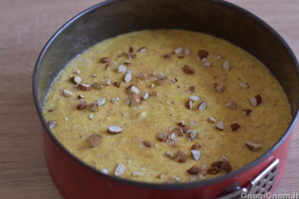 Trasferite il composto in una teglia del diametro di 24 cm, imburrata, unta con olio o rivestita di carta da forno. Decorate con la granella di mandorle e lo zucchero di canna.