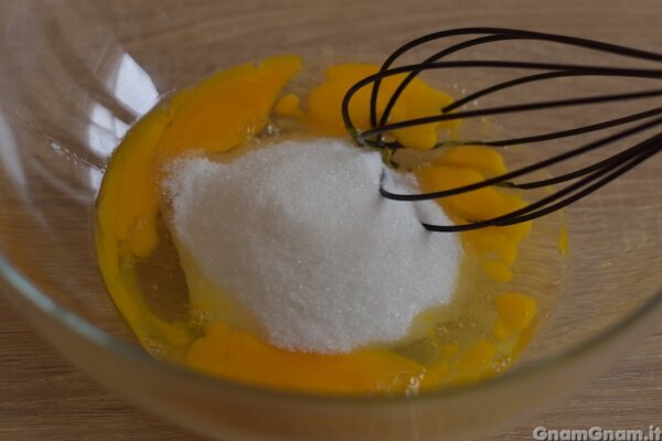 In una ciotola lavorate le uova a temperatura ambiente con lo zucchero.