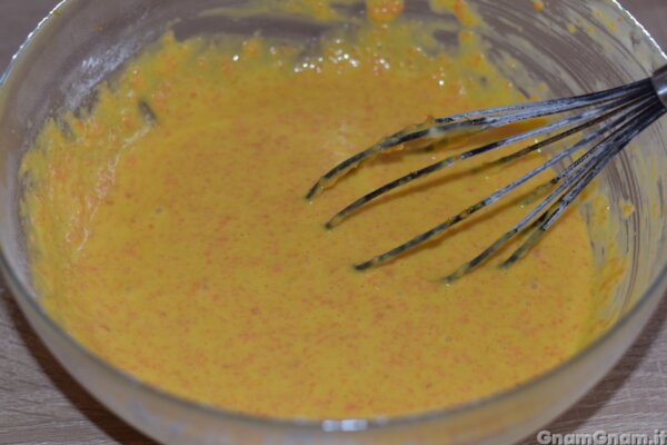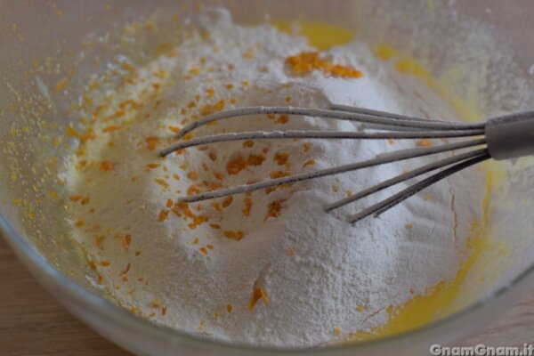 Aggiungete farina e lievito setacciati e la buccia d’arancia grattugiata.