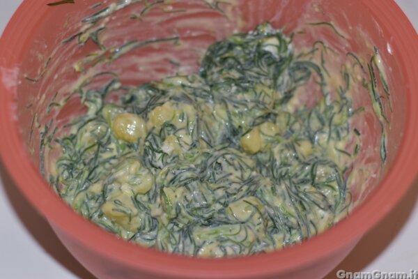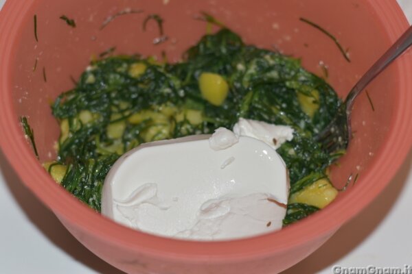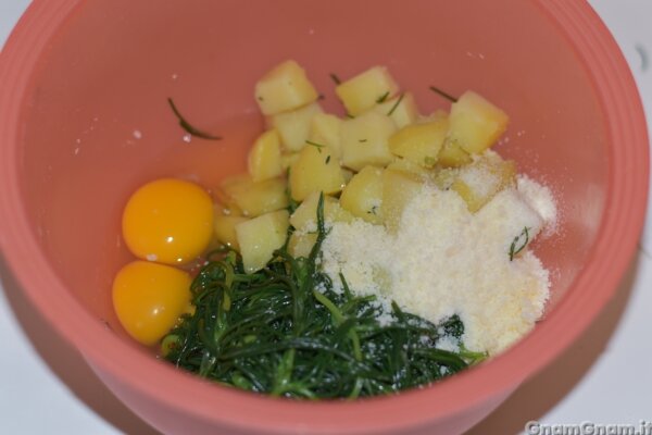 In una ciotola mescolate agretti, patate, uova, un pizzico di sale e parmigiano.