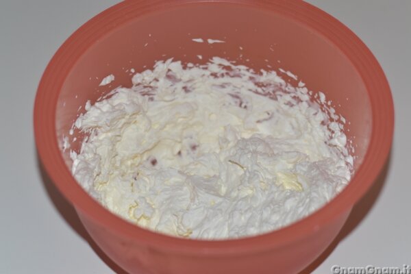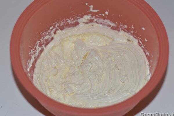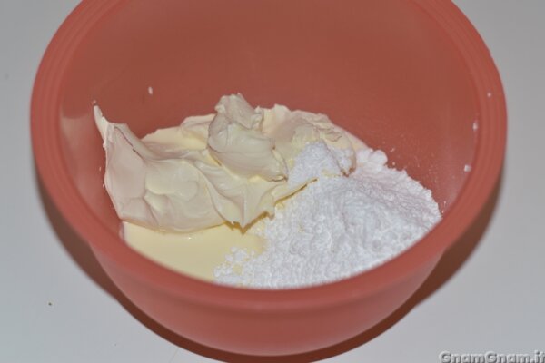 Nel frattempo in una ciotola metti mascarpone, zucchero a velo e panna.