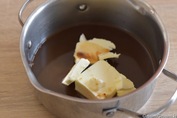 In un pentolino mettete acqua, zucchero, caffè e burro.