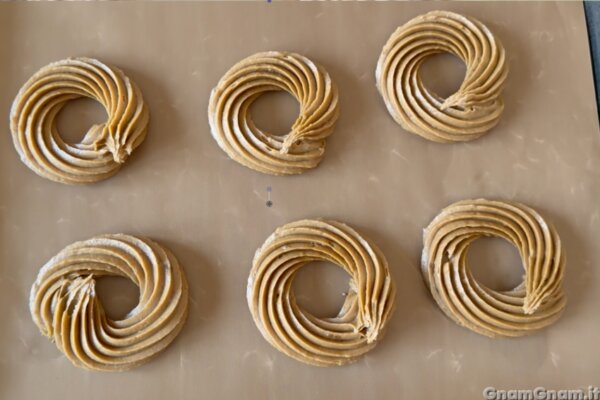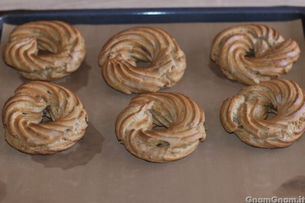 e formate le vostre zeppole su una teglia rivestita di carta da forno. Io sporco la teglia con un po’ di impasto prima di mettere la carta, in questo modo si attacca e non si muove durante la formazione delle zeppole.